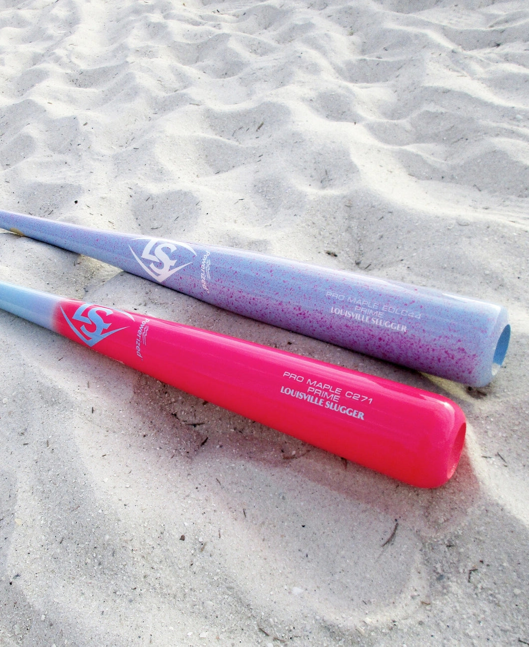 The Pro Prime EDLC44, a maple baseball with a slightly-endloaded swing weight, is perfect for run producers and stronger hitters looking for a more whip-like feel. A light blue base with neon pink splatter creates a lavender-like appearance, complete with white Seamless Decals. A re-engineered surface hardening process, including our Professional Series Finish cured with UV light treatment, results in bats 30% harder than previous Louisville Slugger Prime models.