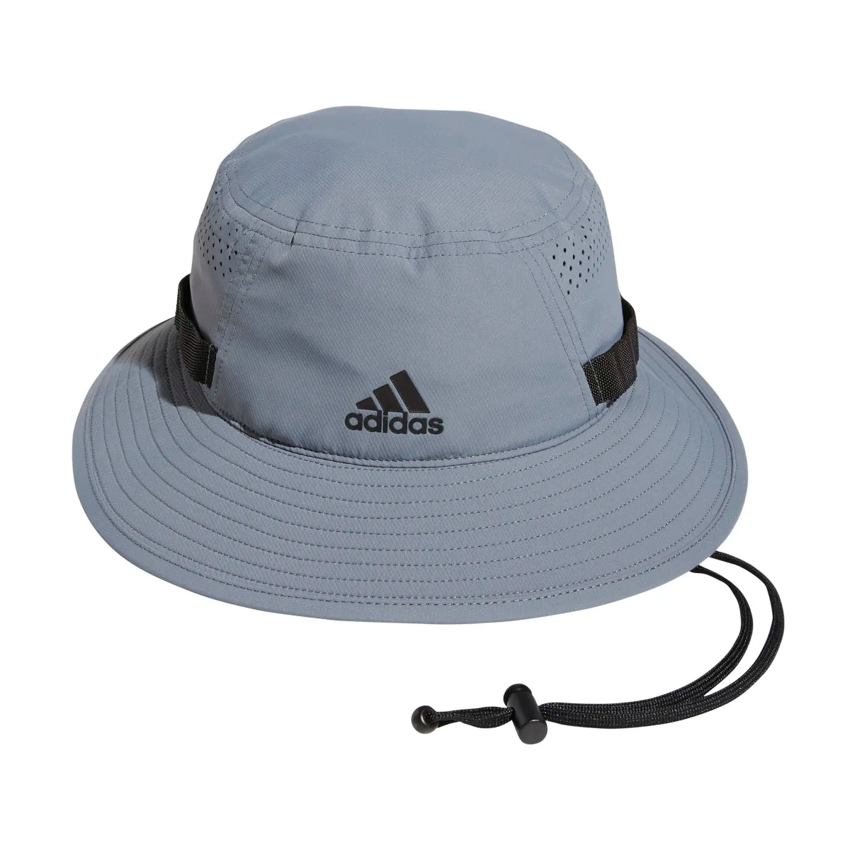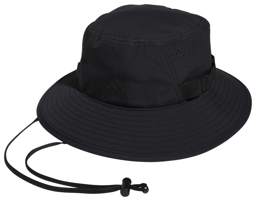 Top off your look with laid-back style. This adidas bucket hat keeps things chill under the sun with its moisture-wicking sweatband and mesh ventilation. Built-in UV 50 factor adds extra coverage, and an adjustable chin strap lets you customize the fit.