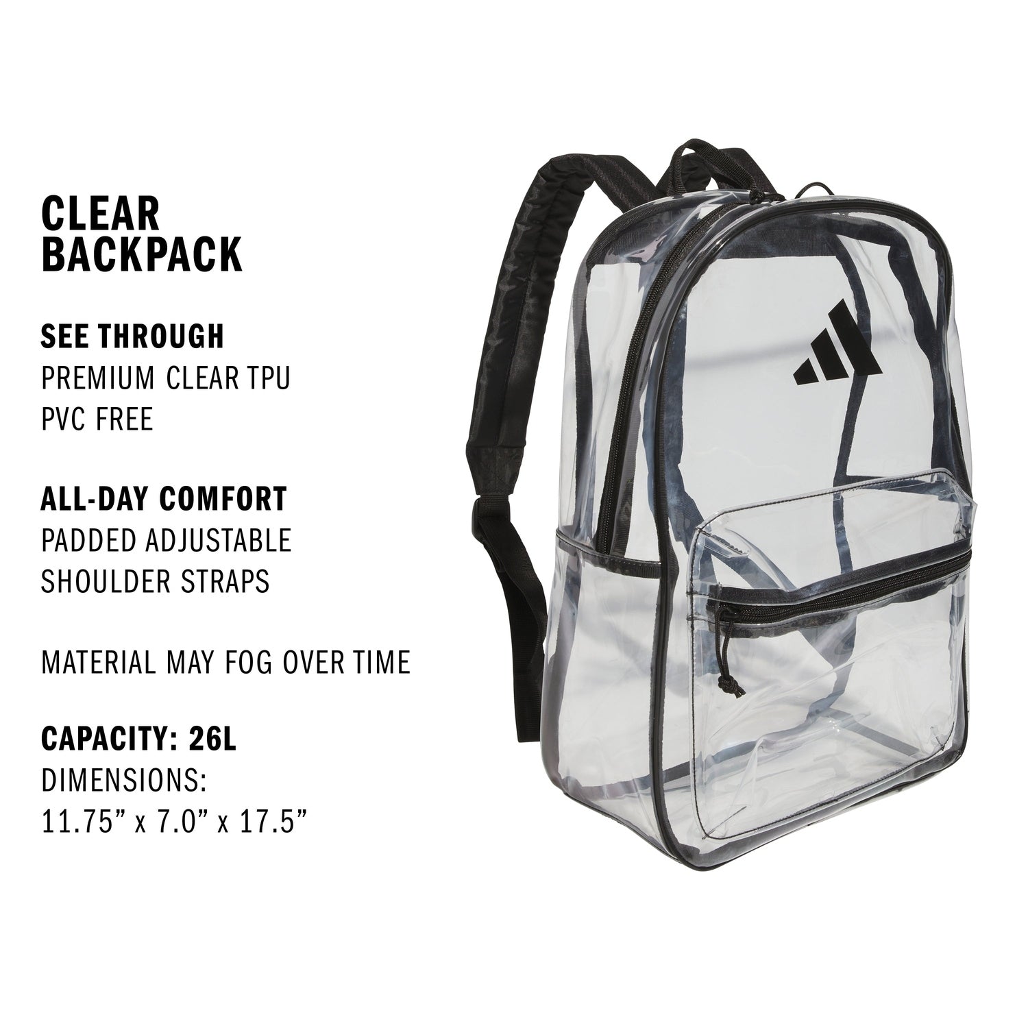 Find what you need at a glance, from your gym tee to your notebook. This clear adidas backpack is made from PVC-free TPU fabric that's strong and flexible so it stands up to everyday knocks. Padded shoulder straps make long journeys smoother.
