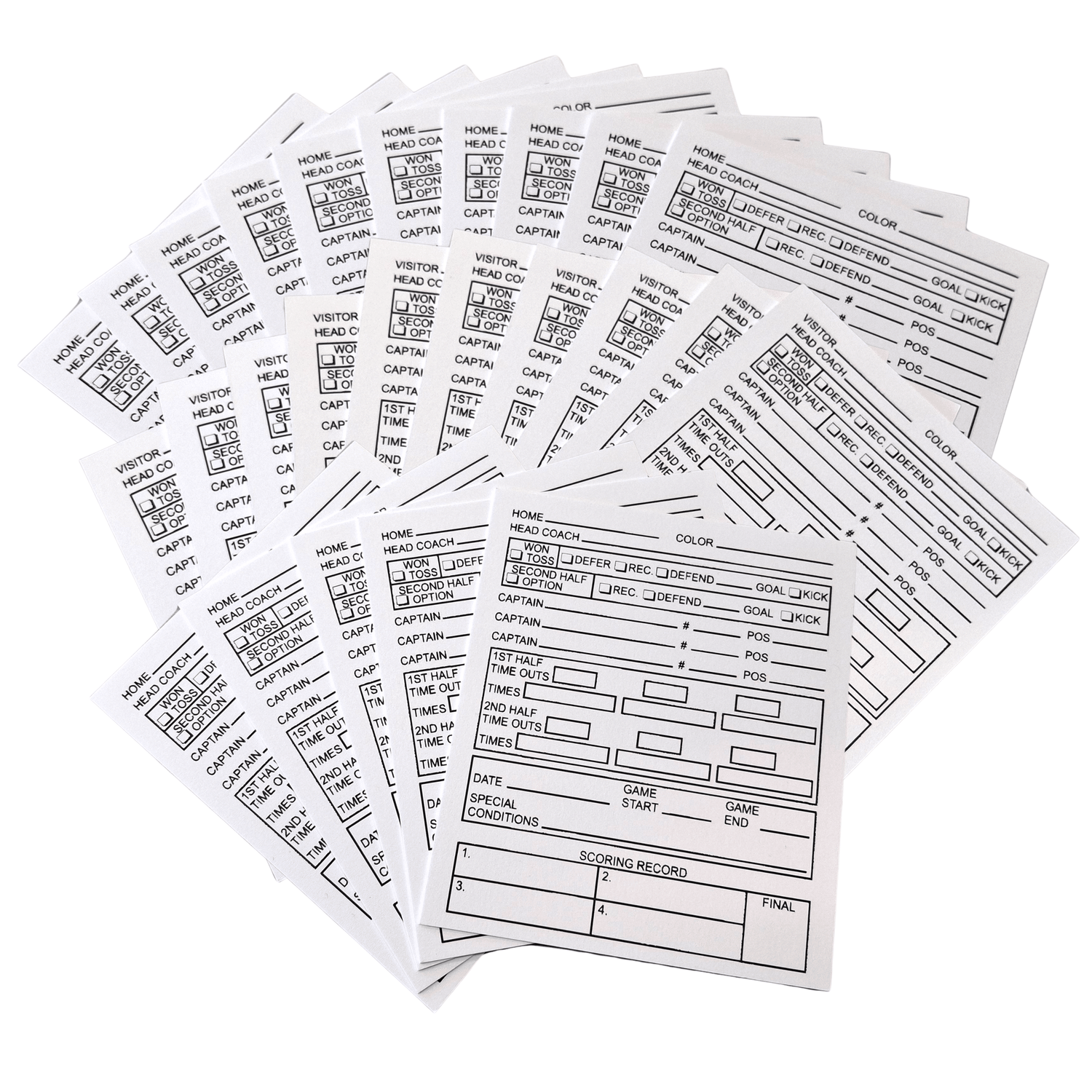 Keep your game officiating organized and efficient with these Referee Game Cards. This pack of 25 cards provides a practical tool for tracking plays, time outs, and game statistics during matches. Designed for coaches, referees, and sports administrators, each card offers ample space for detailed notes and quick reference information. Durable construction ensures these cards withstand the demands of sideline use throughout the season. Whether you're managing youth leagues or competitive play, these game cards streamline your officiating workflow and maintain consistent record-keeping standards.