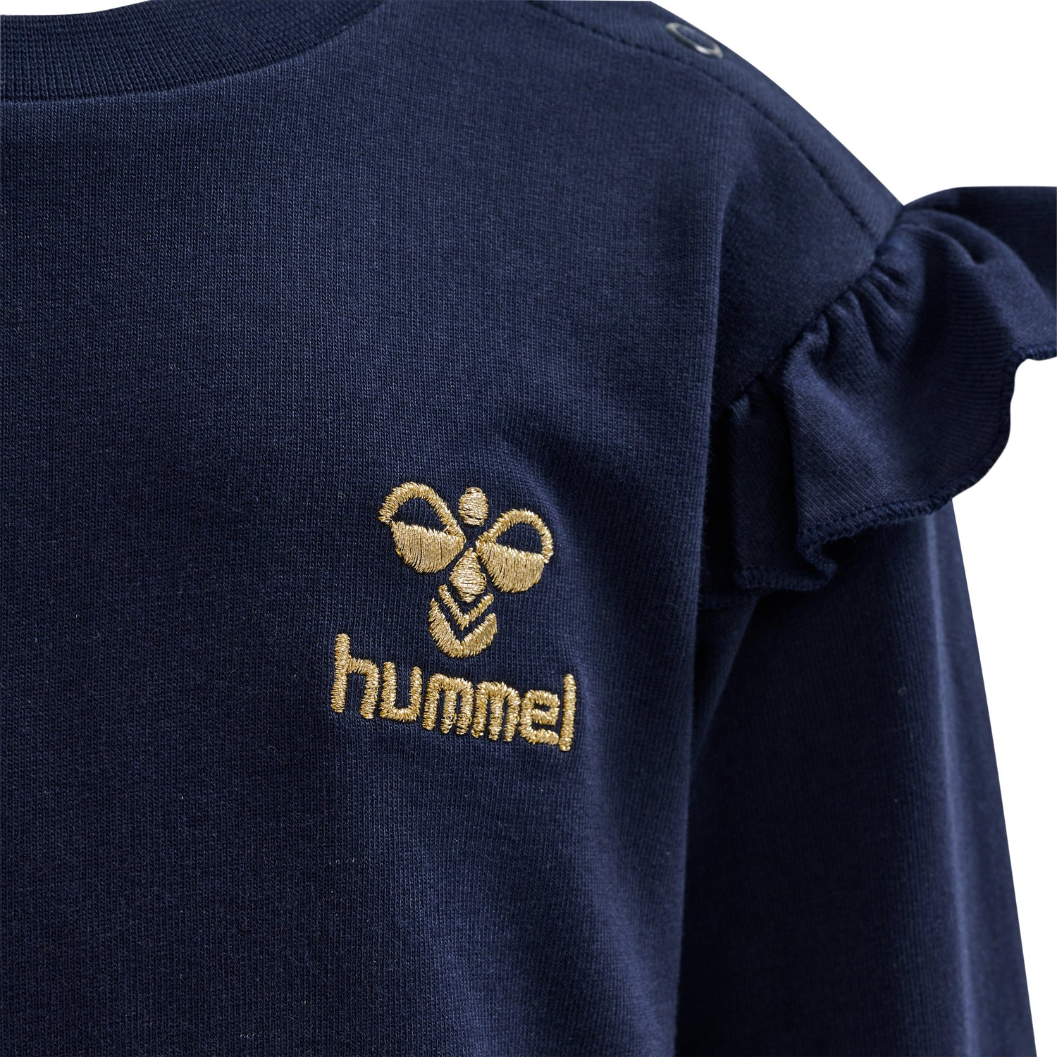 Cut from comfortable cotton sweat fabric, the Dropped Shoulder Sweatshirt is crafted with pretty frills at the dropped shoulders. This Hummel top features a press popper fastening on the shoulder and ribbed trims for a snug fit. It’s complete with a contrasting Bumblebee logo embroidered with metallic thread and chevrons on the sleeves.